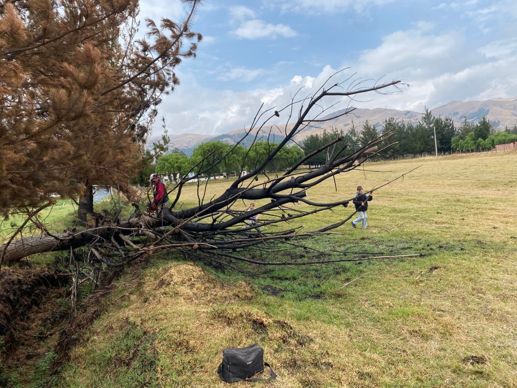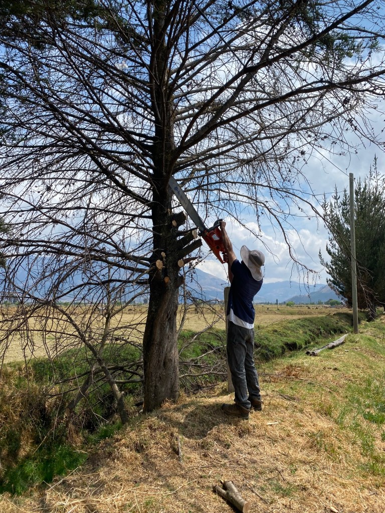 On Saturday, the men folk worked on the fallen pine tree and the dead cedar. The pine had fallen some months ago in a wind storm, but we hadn’t had the time or opportunity to get it worked up. Alicia’s son Walter has a chainsaw, so I asked if we could borrow it. He kindly brought it and helped us for a couple of hours. Now, the ditch is cleaned up, and we have a large stash of firewood.