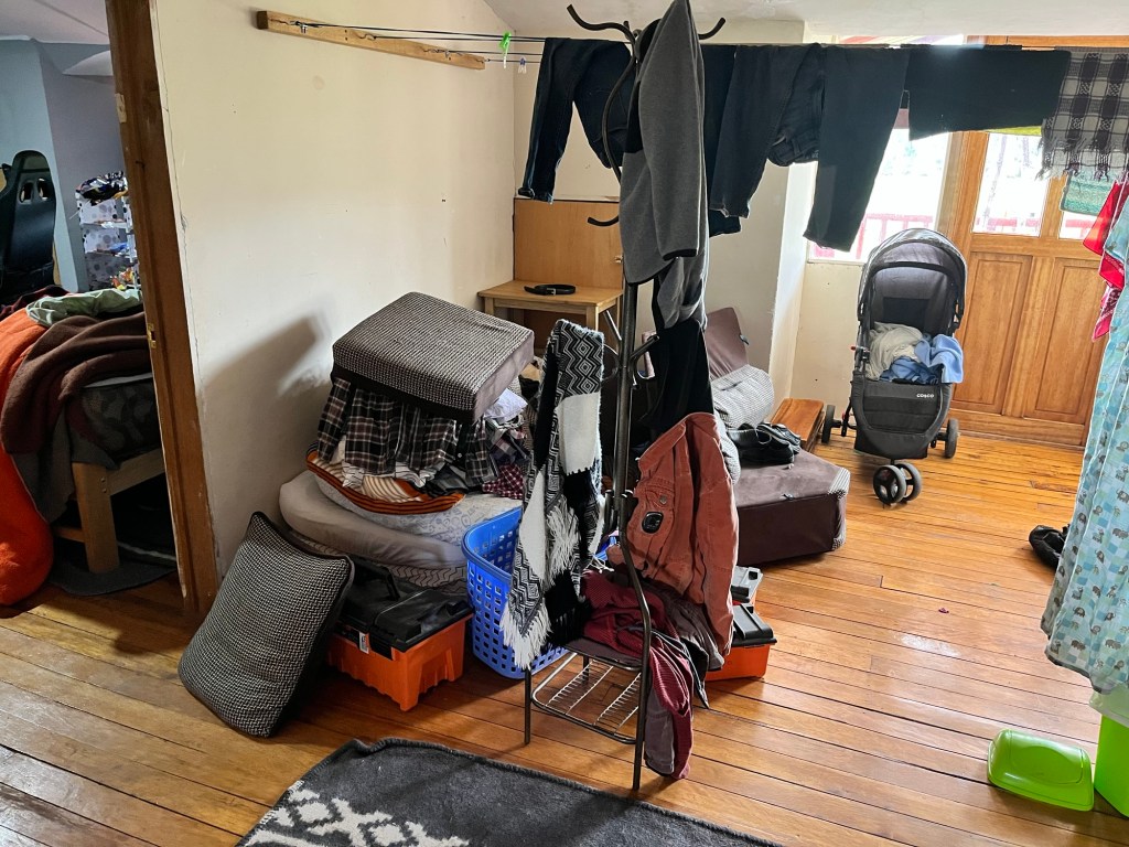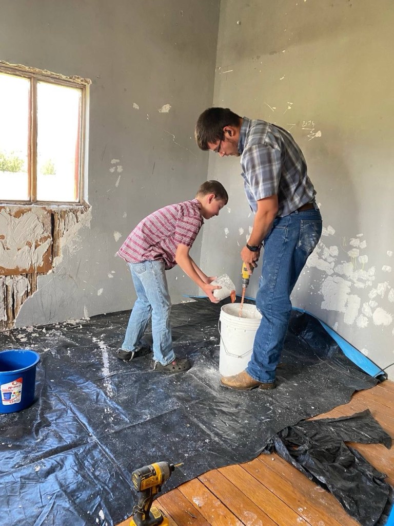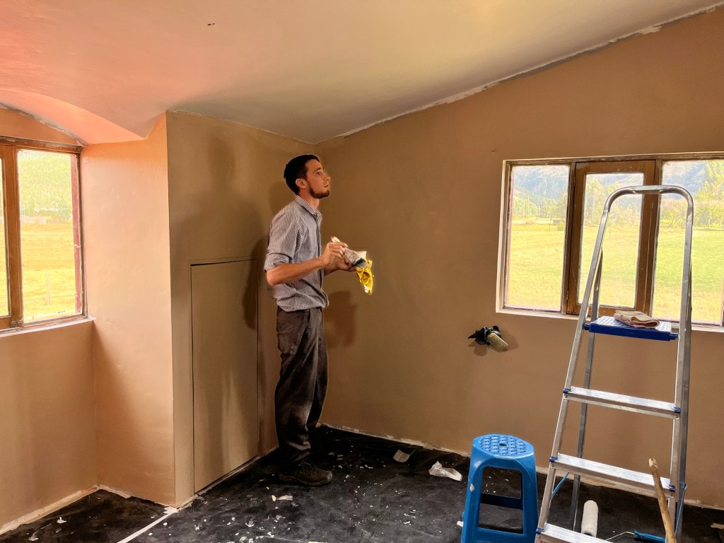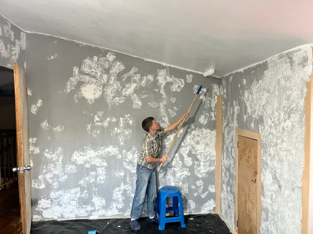 After that, Percy stepped in and took on the task of smoothing things out with a thinner coat of spackling. I was honestly surprised at how much patching was needed. By the end of it, there was hardly any of the original gray paint visible! The walls looked more like a snowstorm than a bedroom at that point.