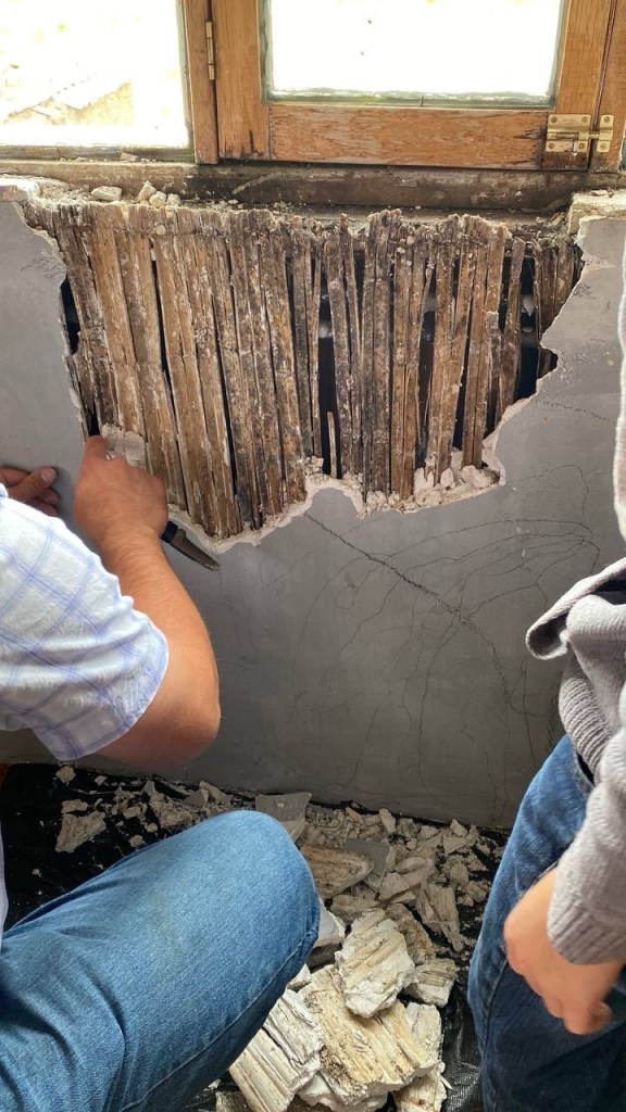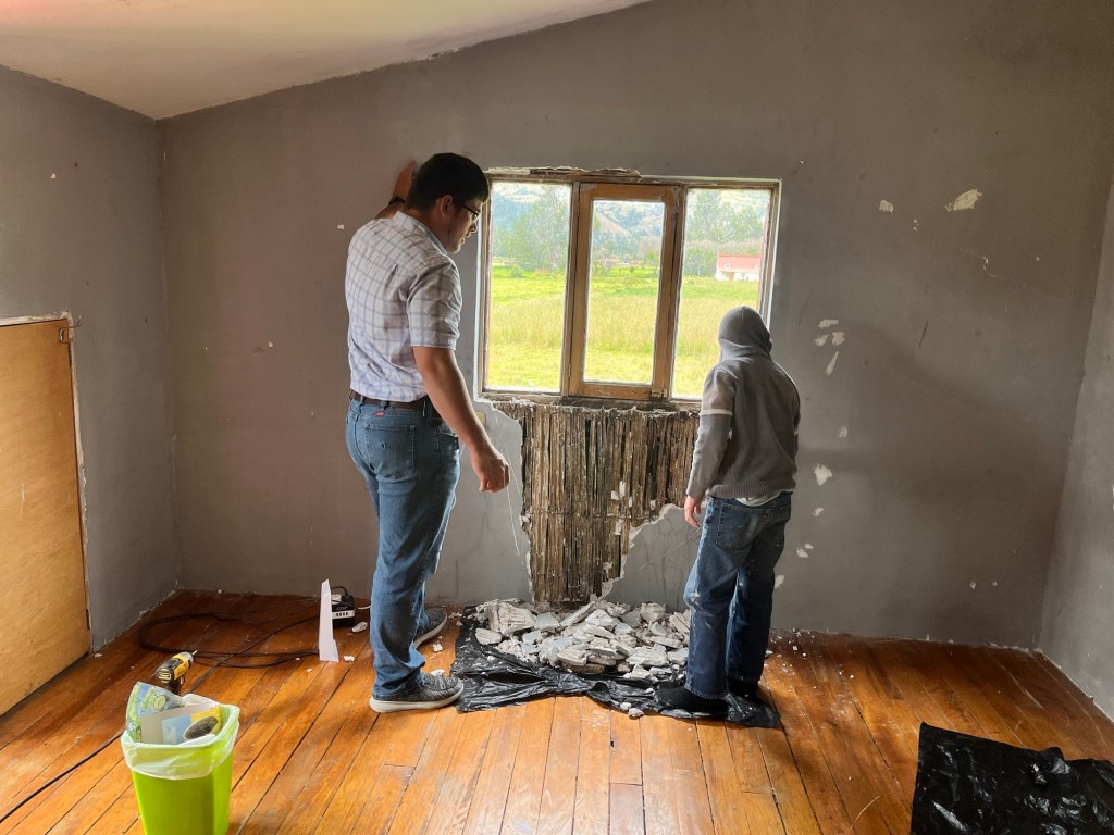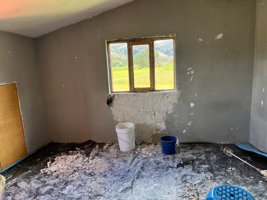 Nathan got the project started by emptying the room and tearing out the worst of the water-damaged plaster. He spent quite a bit of time filling the larger holes and making the rough spots manageable again.